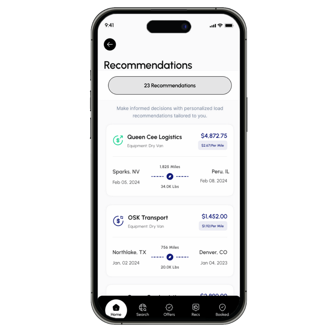 Loadie continuously looks for loads while you drive, deliver, or rest. Loadie also gives you recommendations based on your previous searches, your last availability, or home base.